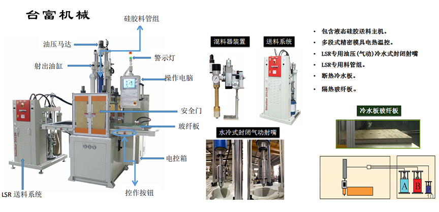 臺富機械有限公司可根據客戶的要求設計所需的液態硅膠注塑成型設備,再配合歐、日、臺名廠的組配件和研發團隊不斷改進并提供全套的液態硅膠設備的解決方案:送料機、成型機、混配系統、色漿泵、硅膠模具等,讓產品達至客戶理想的水準如:成本低、效率 更快、精度高、壽命更長、操作維護更加便捷方便
